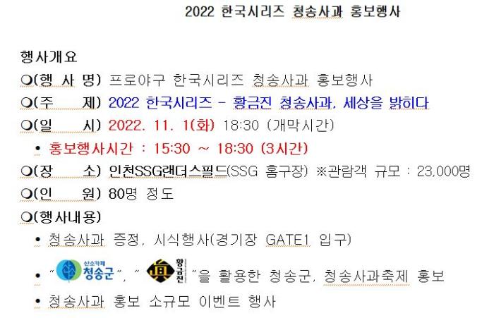 청송군(군수 윤경희)과 청송군의회(의장 권태준)는 오는 11월 1일 인천문학경기장 SSG랜더스필드에서 열리는 ‘2022 한국시리즈 개막전’에서 생산자단체와 농협 등 사과유통 관계자들과 함께 ‘황금진 청송사과, 세상을 밝히다‘는 주제로 청송사과 홍보행사를 연다.