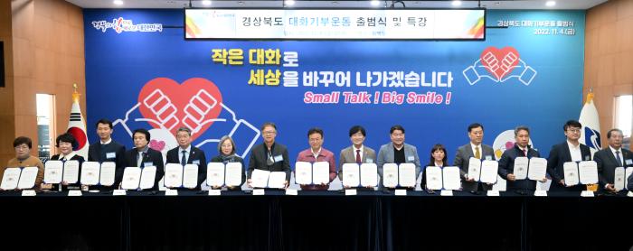 경상북도는 작은 대화로 세상을 바꾸다라는 슬로건으로 전국 최초로 외로움 극복을 위한 대화기부운동을 시작한다고 밝히고 지난 4일 도청에서 출범식을 열었다.