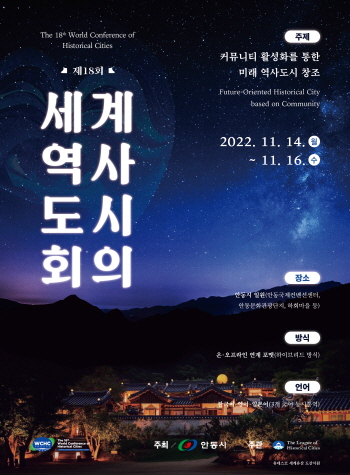 안동시는 21개국 48개 도시가 참가해 “커뮤니티 활성화를 통한 미래 역사도시 창조”라는 주제로 여는‘제18회 세계역사도시회의’를 오는 11월 14일부터 11월 16일까지 사흘간 안동국제컨벤션센터에서 개최한다.