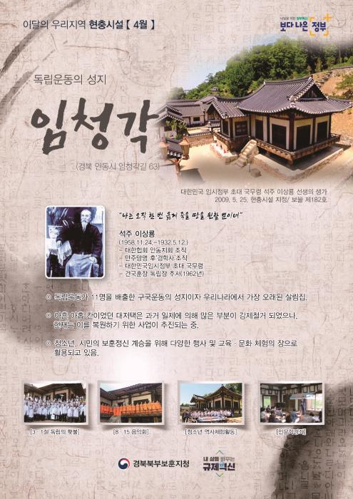 2009년 5월 25일 현충시설로 지정된 임청각(보물 제182호)은 대한민국 임시정부의 초대 국무령을 지낸 석주 이상룡선생의 생가로, 석주선생을 비롯하여 독립운동가 11명이 배출된 독립운동의 성지다.
