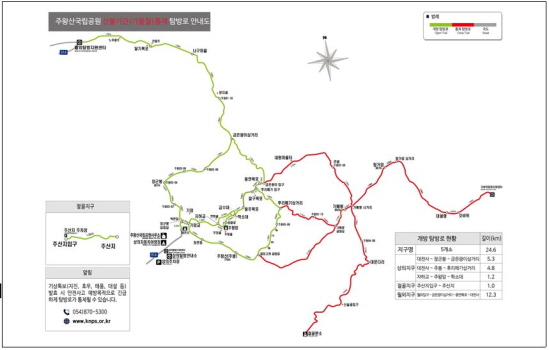 개방 및 통제 탐방로: 개방 5구간(24.6km), 통제 9구간(38.6km)
