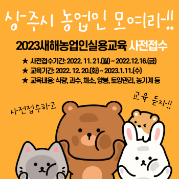 상주시농업기술센터는 2022년 12월 20일(화)부터 2023년 1월 11일(수)까지 총 12개 과정, 20회에 걸쳐 1,800명을 대상으로 농업기술센터, 읍면회의실, 지역농협회의실 등에서 ‘2023 새해농업인실용교육’을 실시한다.