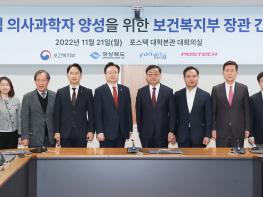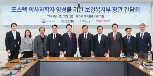 간담회에서는 조규홍 보건복지부 장관, 김학홍 경북도 행정부지사, 이강덕 포항시장, 김무환 포스텍 총장 등 30여명이 참석한 가운데 의사과학자 양성을 위한 복지부 관계자를 대상으로 적극적인 설득에 나섰다.