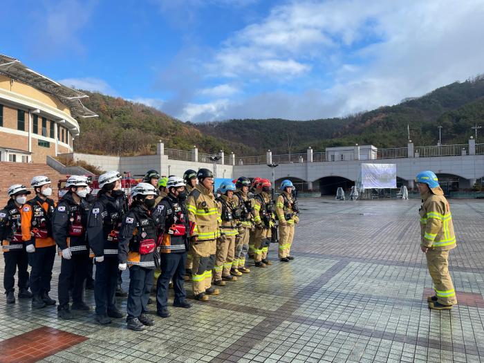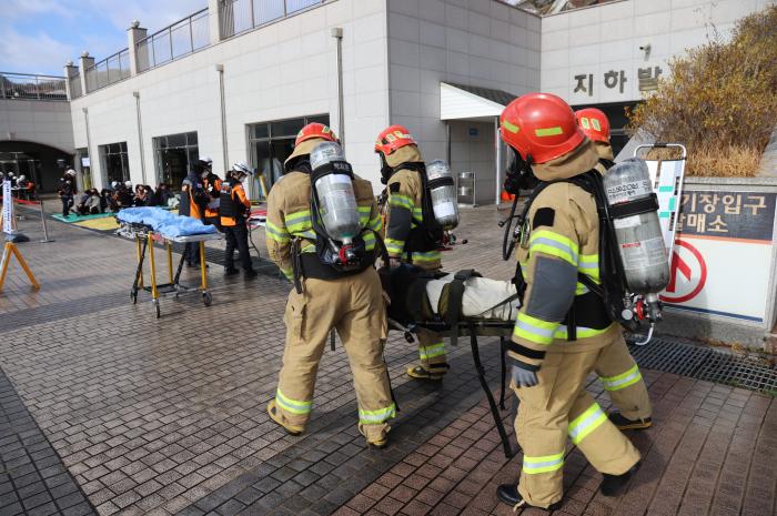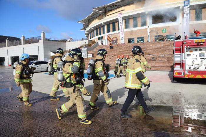 경상북도 소방본부는 23일 오후 청도 소싸움경기장에서 지진으로 인한 대형화재, 건불 붕괴에 따른 다수사상자 발생 상황을 가정한 '복합재난대비 긴급구조종합훈련'을 실시했다.