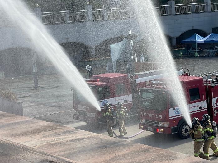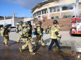 이번 훈련은 먼저, 1단계로 규모 4.2지진으로 인한 용암온천 화재 발생에 따른 자위소방대 초기대응과 청도소방서 긴급구조통제단 가동 훈련이 진행됐다.