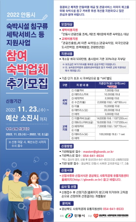 안동시는 『2022 숙박시설 침구류 세탁서비스 등 지원사업』참여 숙박업체를 11월 23일(수)부터 추가 모집한다.
