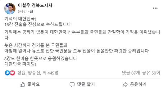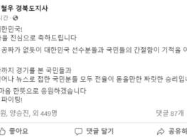 이철우 도지사는 “기적의 대한민국! 16강 진출을 진심으로 축하드립니다”라며 말문을 열었다.