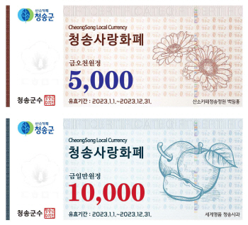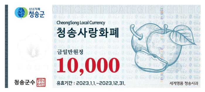 군은 지역경제에 활력을 불어넣고 소비촉진을 통한 경기부양을 위해 2023년도 ‘청송사랑화폐’를 총 700억원 규모로 확대해 발행할 계획이다. 10% 상시할인판매를 610억으로 유통할 예정이며, 이는 2022년도 490억보다 130억 증액한 금액이다.