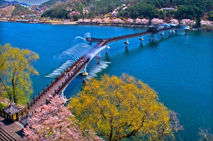 눈부신 햇살에 일렁이는 낙동강 물결 위로 고즈넉한 월영교 다리를 거닐면, 만개한 벚꽃나무가 흩날리는 벚꽃 잎으로 맞이한다. 어느새 안동댐 민속촌의 한적한 풍경이 다가와 아늑함을 전해주고, 개목나루 앞에서는 황포돛배가 물살을 가르며 봄을 마중하러 나선다.