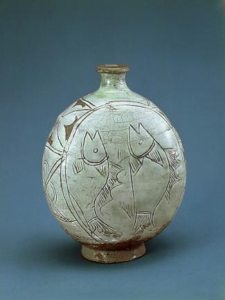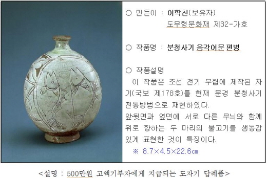 대한민국 도예명장이자 경북무형문화재인 이학천 명인(도무형문화재 제32-가호)의 작품인 이 도자기는 조선 전기 무렵에 제작된 자기(국보 제178호)를 현재 문경 분청사기 전통방법으로 재현한 것으로 앞․뒷면과 옆면에 서로 다른 무늬와 함께 위로 향하는 두 마리의 물고기를 생동감 있게 표현한 것이 특징이다.