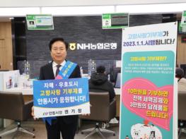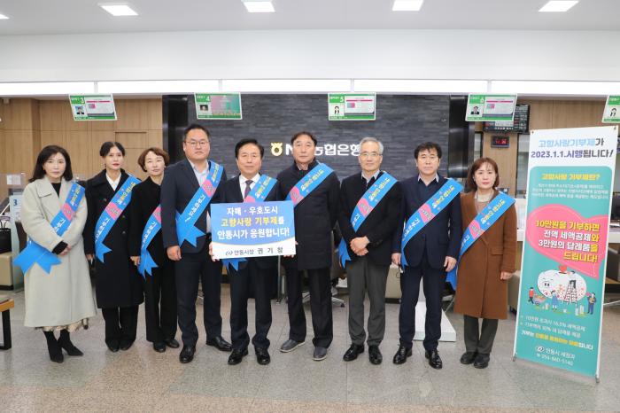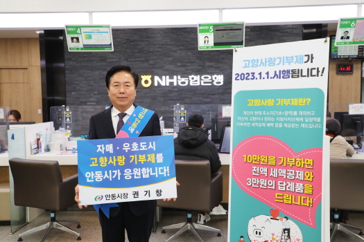 권 시장은 13일 NH농협은행 안동시지부를 방문해 안동시와 자매결연인 경기도 이천시, 전라북도 전주시, 경상남도 진주시, 서울특별시 송파구, 종로구, 충청남도 공주시, 강원도 강릉시와 함께 우호교류를 맺은 서울특별시, 대구광역시, 그리고 교류 추진 중인 전라남도 목포시 등 총 10개 도시에 고향사랑기부금을 기탁 했다.