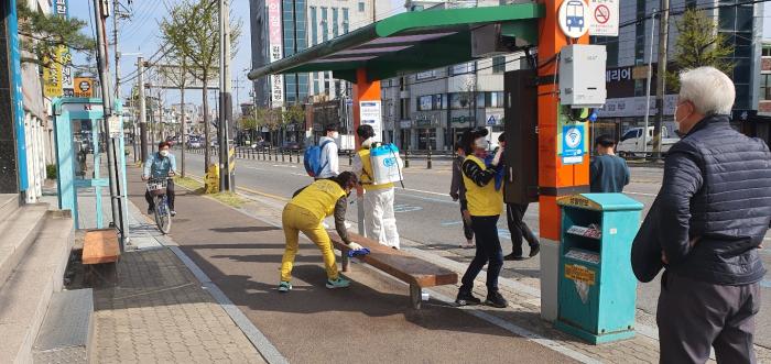 자율방재단원들은 지난 10일(토) 무더운 날씨에도 불구하고 오전부터 오후까지 무더위 쉼터, 버스 정류장, 정자 등 사람들이 많이 모이는 곳을 위주로 코로나19 방역 활동을 시행했다.