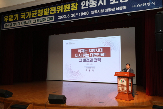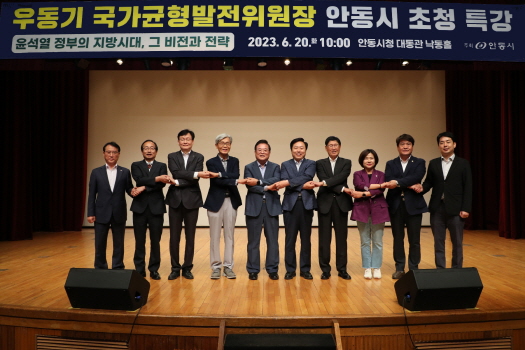 안동시는 20일 안동시청 대동관(낙동홀)에서 우동기 국가균형발전위원장을 초청해 ‘이제는 지방시대 다시 뛰는 대한민국! 그 비전과 전략’을 주제로 특별강연을 개최했다.