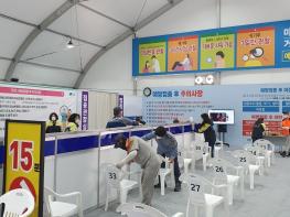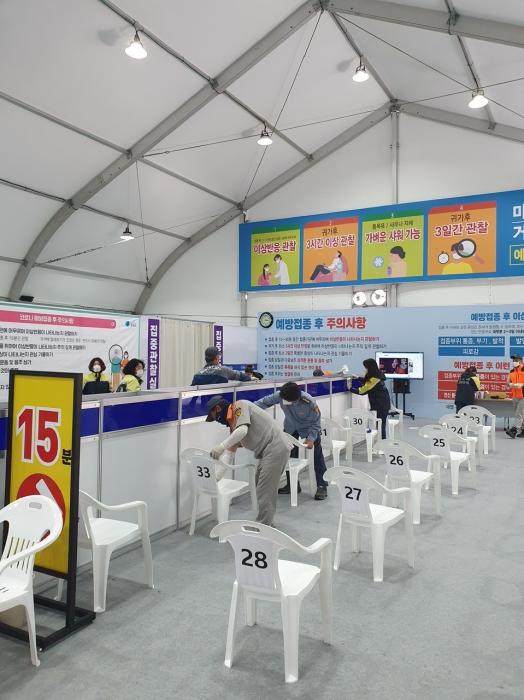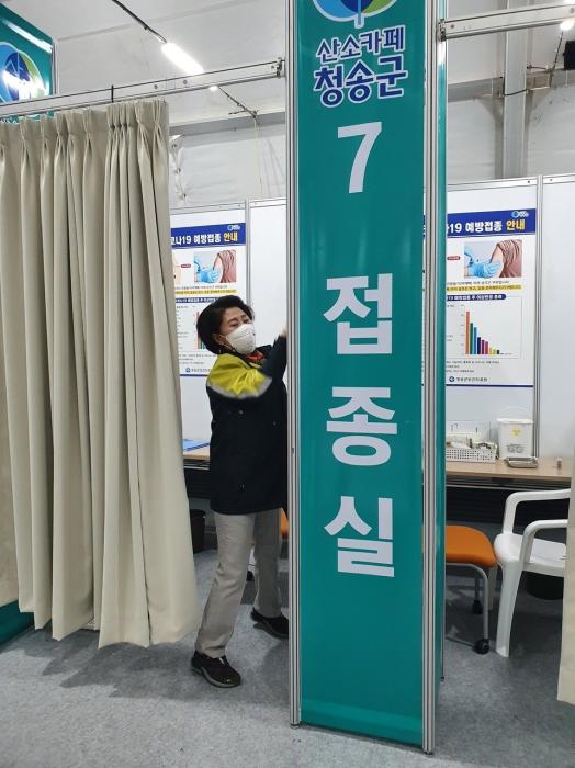 임일지(남), 마정연(여) 남·녀 연합회장 등 40명의 의용소방대원이 참여한 가운데 15일부터 시작된 청송군민의 백신접종이 청결한 환경 속에 진행될 수 있게 하는 지원이다.