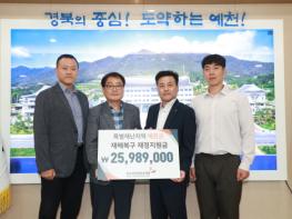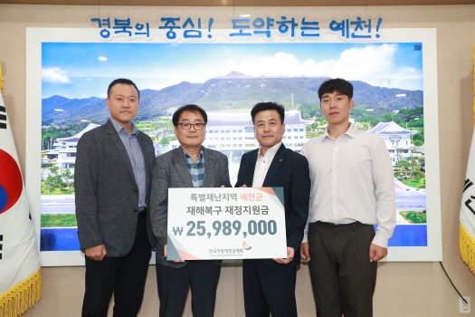 예천군(군수 김학동)은 한국지방재정공제회로부터 특별재난지역 재해복구 재정지원금 2,598만 원을 전달받았다고 24일 밝혔다.