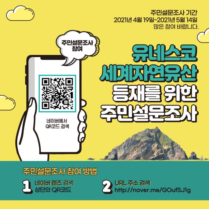 설문조사는 울릉군청 홈페이지 참여광장 자유게시판에서『울릉도·독도 유네스코 세계자연유산 등재를 위한 설문조사』를 검색하면 찾아볼 수 있다. QR코드 인증을 통해 모바일로 참여할 수 있으며 URL 주소를 검색해서 설문조사에 참여하는 방법도 있다.