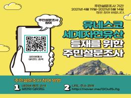 (울릉군=경북온뉴스) 우미영 기자 = 울릉군은 4월 19일부터 5월 14일까지 지역주민들을 대상으로 유네스코 세계자연유산 등재 추진에 관한 설문조사를 실시한다.