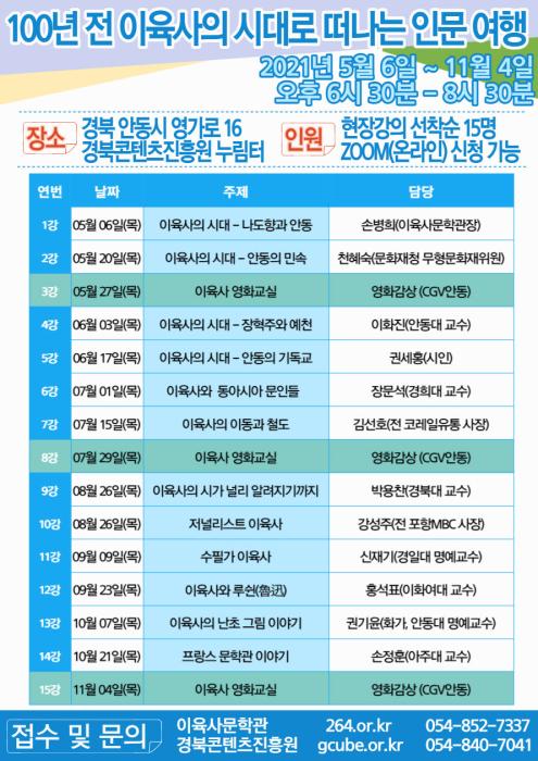 ‘이육사의 시대-나도향과 안동(손병희, 이육사문학관장)’, ‘이육사의 난초그림 이야기(권기윤, 안동대 명예교수)’ 등 총 15강좌로 구성된 이번 강의는 ‘covid-19’ 방역 지침에 따라 현장 수강생 15명과 온라인(zoom) 수강생을 중심으로 진행된다.