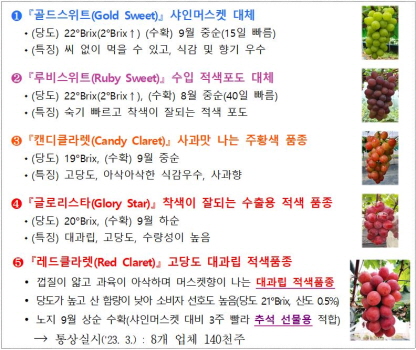 경상북도농업기술원은 포도 주산지의 위상을 지키기 위해 수확기, 과피색, 모양 등 품종 차별화와 해외 지급 로열티 경감, 특정 품종 홍수 출하에 따른 가격 급락 방지, 수출 경쟁력 향상을 위한 품종 다변화를 목표로 10년 동안 8개의 포도 신품종을 육성해 왔다.