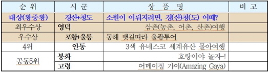 ‘2023 경북 대표관광상품 왕중왕전 공모’ 최종 평가 결과 ‘경산시+청도군’권역연계 상품이 왕중왕(대상)에 선정되었다.