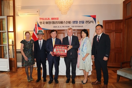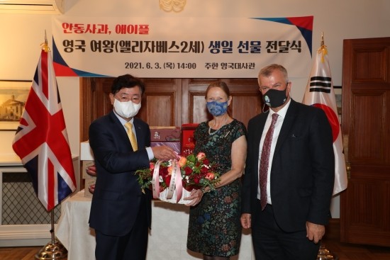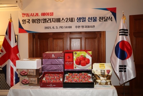안동시는 안동농협과 함께 6월 3일 엘리자베스 2세 영국 여왕의 95세 생일을 맞아 농협무역(주)을 통해 주영 한국대사관에 ‘안동사과’와 ‘애이플’ 사과 100상자(5Kg, 3kg)를 전달했으며, 오는 6월 12일 영국 여왕의 생일 축하선물로 버킹엄 궁에 전해질 예정이다.